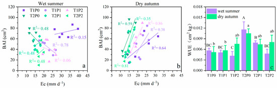 Differences in synergistic patterns of change in stand-scale basal area increment (BAI) and transpiration (Ec) in wet summer (a) and dry autumn (b), i.e., differences in water use efficiency (WUE) under different thinning and pruning treatments (c). Different uppercase letters and lowercase letters represent significantly different means between treatments in wet summer and dry summer (p < 0.05), respectively.