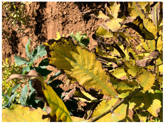 Leaf yellowing and scorching observed in Mongolian oak seedlings at the Qiliting Demonstration Field in the Hongyashan state-owned plantation in Hebei Province, China (altitude, 49 m) during summer (June–August).
