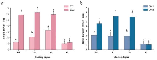 Effects of shading treatments on height and diameter growth in Mongolian oak seedlings. Different letters in the same year indicate significant differences (p < 0.05) among treatments. (a) Height growth. (b) Basal diameter growth.