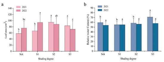 Effects of shading treatments on leaf area and relative water content of Mongolian oak seedlings. Different letters in the same year indicate significant differences (p < 0.05) among treatments. (a) Leaf area. (b)Relative water content.