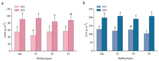 Effects of shading treatments on dry leaf mass per area (LMA) and fresh leaf mass per area (LFA) in Mongolian oak seedlings. Different letters in the same year indicate significant differences (p < 0.05) among treatments. (a) leaf mass per area (LMA). (b) fresh leaf mass per area (LFA).