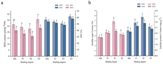 Effects of shading treatments on the contents of osmotic substances in Mongolian oak seedling leaves. Different letters in the same year indicate significant differences (p < 0.05) among treatments. (a) Malondialdehyde (MDA) content and relative conductivity (REC). (b) Soluble sugar and soluble protein contents.