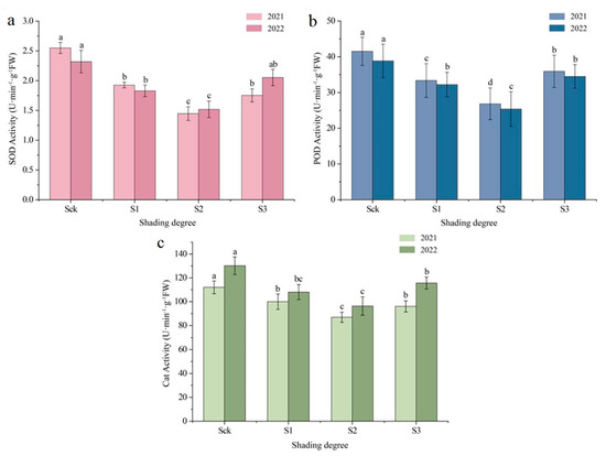 Effects of shading treatments on the activity levels of antioxidant enzymes. Different letters in the same year indicate significant differences (p < 0.05) among treatments. (a) superoxide dismutase (SOD), (b) peroxidase (POD), and (c) catalase (CAT) in Mongolian oak seedlings.