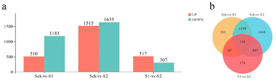 A comparison of the numbers of DEGs among the three comparison groups showed that higher degrees of shading had a greater impact on gene expression in Mongolian oak (i.e., more DEGs were detected). Using a false detection rate (FDR) ≤ 0.05 and log fold change |log2(FC)| ≥ 1 as screening criteria, we detected a total of 3726 DEGs. In Sck-S1, a total of 1691 DEGs were detected, of which 1181 were upregulated and 510 were downregulated. Sck-S2 had a total of 3150 DEGs (1635 upregulated, 1515 downregulated), and S1–S2 had a total of 824 DEGs (307 upregulated, 517 downregulated). These results showed that the fewest DEGs were detected in S1–S2, with 2- and 3.8-fold more DEGs detected in Sck-S1 and Sck-S2, respectively, than in S1–S2. A Venn diagram of the DEGs in the three comparison groups showed that 134 DEGs appeared in all three groups, with 333 unique DEGs in Sck-S1, 1410 unique DEGs in Sck-S2, and 178 unique DEGs in S1–S2 (Figure 7).