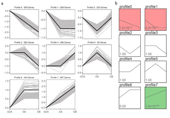A trend analysis of the 3726 DEGs detected under different degrees of shading resulted in a total of eight patterns (Figure 8). Significant enrichment of DEGs was observed in profiles 1, 7, and 0 (p < 0.05), and the number of DEGs enriched in these modules was also highest, with 928, 897, and 559 genes, respectively. In profile 1, the expression of 928 genes was downregulated in S1 but stabilized in S2. In profile 7, the expression of 897 genes was upregulated in association with increasing shade intensity. In profile 0, the expression of 559 genes displayed a downward trend with increasing shading. In summary, profiles 0 and 1 showed downward gene expression trends, whereas profile 7 showed an upward trend.