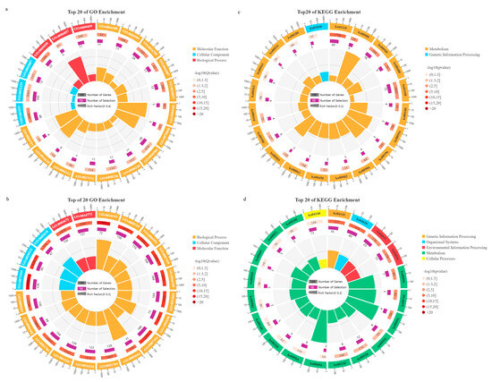 Enrichment results for DEGs with significant expression trends in (a,c) module 7 and (b,d) modules 0 and 1. GO, Gene Ontology; KEGG, Kyoto Encyclopedia of Genes and Genomes.