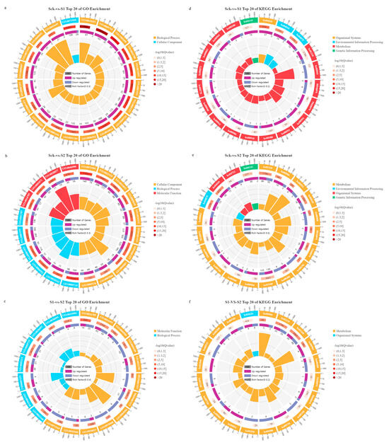 Enrichment analysis of GO functions and KEGG pathways. (a–c) GO functional enrichment analysis of comparisons Sck vs. S1, Sck vs. S2, and S1 vs. S2, respectively. (d–f) KEGG pathway enrichment analysis of comparisons Sck vs. S1, Sck vs. S2, and S1 vs. S2 comparison groups.