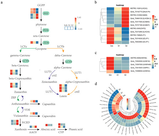 The DEGs that were significantly correlated with the photosynthetic metabolic pathway, i.e., with carotenoid and photosynthetic antenna protein synthesis, in the three comparative groups were further analyzed. The results showed that 16 DEGs were involved in carotenoid synthesis and 7 DEGs were involved in photosynthetic antenna protein synthesis. The carotenoid biosynthesis pathway can be divided into three stages (Figure 11a), with isoprene as the unit to first form lycopene, then cyclize to form carotenoid substances and finally lutein substances. In the first stage of carotenoid synthesis in Mongolian oak leaves, four genes encoding the PSY enzyme and one gene encoding the ZDS enzyme were upregulated in Sck. During the second stage, lycopene cyclization occurred with the formation of α- and β-carotenoids, although this process exhibited no specific gene expression. The genes encoding LUT5, LUT1, and crtZ enzymes in the third stage were upregulated in Sck, resulting in an increase in lutein and zeaxanthin synthesis, which may be the main reason for the yellowing of leaves in Sck. Additionally, the NCED gene was upregulated in S2, and genes encoding CYP and AOG were upregulated in Sck. The expression levels of six genes encoding photosynthetic antenna protein (i.e., light harvesting antenna, LHC) increased significantly as shading increased (Figure 11b). Among the families related to light protection, one gene encoding light inducible protein (OHP), two genes encoding photosystem II subunit (Psb) protein, two genes encoding stress enhancing protein (SEP), and three genes encoding early light inducible protein (ELIP) had high expression levels in Sck. In addition, the expression level of one LHC gene (Qrob T0273280.2) gradually decreased. A cluster analysis revealed that this gene clustered with the gene encoding the ELIP protein, suggesting that this LHC gene may also be involved in light stress protection.