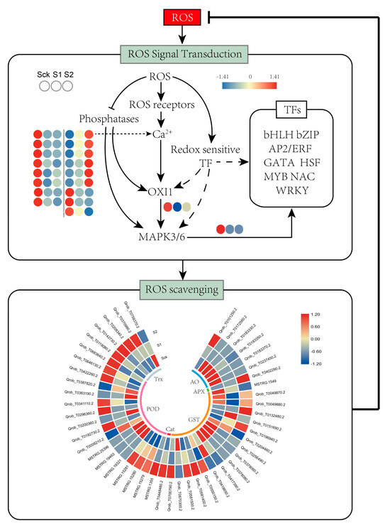 Some genes related to antioxidant enzymes were significantly differentially expressed under different light intensity levels (Figure 12). For example, of the 17 genes encoding POD, 7 were upregulated in Sck and 10 were upregulated in S2. One CAT gene was upregulated in S2. Among the seventeen glutathione transferase (GST) genes, nine were upregulated in Sck, six were upregulated in S2, and two were upregulated in S1. Other genes encoding antioxidant enzymes were also collected, such as one ascorbic acid peroxidase (APX) gene encoding the enzyme that catalyzes the conversion of ascorbic acid to dehydroascorbate, which was upregulated in S2. Among the six ascorbic acid oxidase (AO) genes that catalyze the conversion of dehydroascorbic acid to ascorbic acid, five were upregulated in Sck and one was upregulated in S2. These DEGs encode antioxidant enzymes involved in the response to light intensity. The ROS signal transduction pathway plays a crucial role in ROS signal detection, reception, and transmission to regulate ROS clearance. In this study, calmodulin genes related to signal transduction were upregulated in Sck and S2, and the number of upregulated genes in Sck was higher than in S2. Genes regulating the OX11 and MAPK3 enzymes were upregulated in Sck. ROS signal transduction can also oxidize and reduce sensitive transcription factors such as HSFs and NPR1. Our results showed that the highest expression levels of HSFs and NPR1 were concentrated in Sck (Figure 11c) and that a large number of phosphatase genes were upregulated in Sck, S1, and S2 (Figure 11d). As the third pathway of ROS signal transduction, the direct inhibition of phosphatase by ROS leads to the activation of downstream calmodulin and phospholipid signals in kinase inhibition sensing, thereby leading to the accumulation of phosphatidic acid.