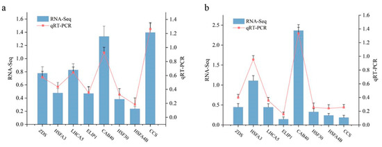 RNA sequencing (RNA-seq) data accuracy was verified by quantitative reverse-transcription polymerase chain reaction (qRT-PCR) for (a) 40% and (b) 20% light intensity.