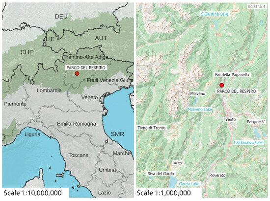 Figure 1. Location of the study area (Parco del Respiro) in Trentino-Alto Adige region, Italy. In the left image, the green area represents the Alps, according to the Alpine Convention 2018. The red point indicates the Parco del Respiro in both images.