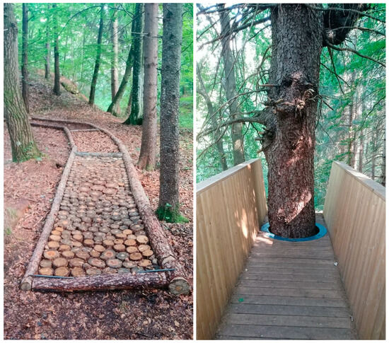Figure 2. Infrastructures to facilitate forest bathing activities in the Parco del Respiro: barefooting path (to the left) and tree-hugging structure (to the right).