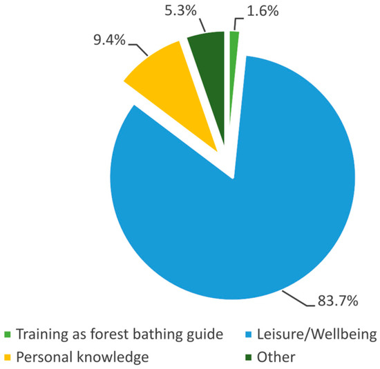 When asked about the information sources, 29.4% of the respondents reported that they had heard about forest bathing at the Parco del Respiro mainly through the internet/blogs/social networks, 24.5% by friends/acquaintances, and 22% by informative material of the Parco del Respiro. Leisure and well-being were the main reasons for forest bathing in the Parco del Respiro, as shown in Figure 3.