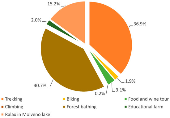 Most respondents indicated that they stayed at the Parco del Respiro for about two hours (68.2%), 27.3% for half a day, 4.1% for the whole day, and only 0.4% for the whole weekend. These results show that the Parco del Respiro is just one of the destinations of a more comprehensive itinerary. In fact, 78.8% of respondents carried out other activities during the day of the visit, while 21.2% dedicated the day exclusively to forest bathing in the Parco del Respiro. The latter percentage of respondents includes only Fai della Paganella municipality residents or local hikers. The percentage of time indicated for the forest bathing activity in the Parco del Respiro (average value 40.7%) was used to estimate the travel costs attributable to only this activity. Regarding the time spent during the visit to the Parco del Respiro for different activities (Figure 4), the most practiced activities after that of forest bathing were trekking followed by relaxing in the Molveno Lake, a well-known tourist destination 20 min (15 km) by car from the Parco del Respiro (15.2%).