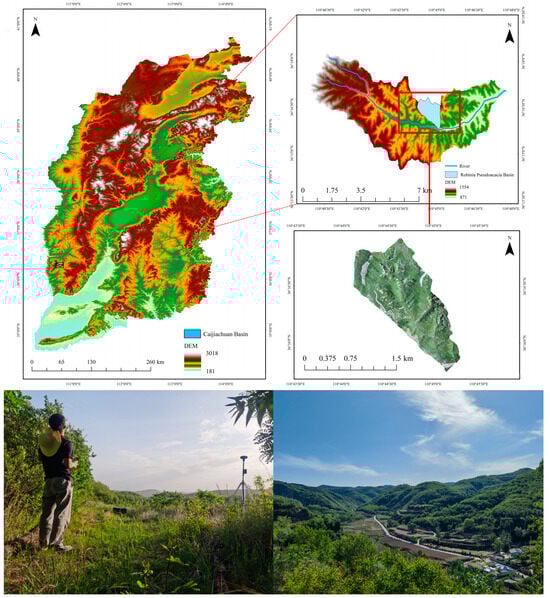 The study area is located in the Caijiachuan River Basin, home to the National Field Scientific Observation and Research Station for Forest Ecosystems in Jixian County, Shanxi Province. The geographical coordinates are 110°39′45″–110°47′45″ E, 36°14′27″–36°18′23″ N. The terrain is high in the east and low in the west, with an area of 39.33 km2 and a basin length of about 14 km. The elevation is 900–1513 m. The annual average temperature is 10.2 °C, and the annual average precipitation is 575.9 mm. Rainfall is mainly concentrated from July to September, accounting for about 59.5% of the annual precipitation. The area has a warm temperate continental climate. The brown soils that predominate in the area are of a Loess parent material and are slightly alkaline. The Caijiachuan River Basin has abundant plant resources, with 194 species of common woody plants, 180 herbaceous plants, and 141 traditional Chinese herbs. Since the 1970s, afforestation has been carried out in the basin, producing a forest coverage rate of over 80%. The upstream mainly consists of natural secondary forests, populated by species such as Populus davidiana and Quercus mongolica; the middle reaches are mainly artificial forests composed of Robinia pseudoacacia and Pinus tabuliformis; and the lower reaches are wasteland and farmland. Apple (Malus pumila), pear (Pyrus spp.), apricot (Armeniaca vulgaris), and other fruit trees are planted in the slope terraced fields. The area of the Caijiachuan River Basin selected for this study, which was planted with acacia forests in the 1990s (Figure 1), has an area of 2.06 km2.