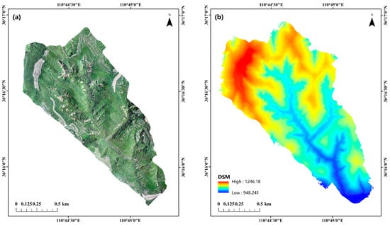 From May to June 2023, a DJI M300RTK UAV equipped with a Zen L1 radar lens was used for data acquisition. The ground mode was used; the flight speed was 10 m/s, the flight height was 80 m, the laser side overlap rate was 80%, and the average point density was 147 points/m2. A total of 43.4 GB of LiDAR data and 2046 UAV images covering the study area were obtained.