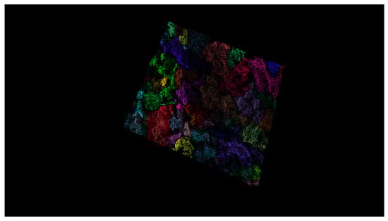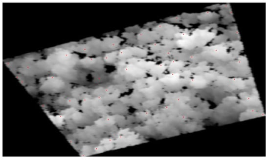 Firstly, individual tree position detection was carried out and the spatial position of the crown vertex was determined. Secondly, the extracted crown vertices were used as seed points to perform individual tree crown segmentation. During tree vertex recognition, a local maximum algorithm was used, and raster data were searched through the moving window step by step to determine whether the center point of the search window was the local maximum value []. If that was the case, the pixel was marked as the tree vertex, and then the watershed segmentation algorithm was used to accurately segment the individual tree crown by using the optimal segmentation window [,]. This was achieved using the point cloud toolbox in MATLAB R2023b. The results of individual tree vertex recognition and individual tree extraction are shown in Figure 3 and Figure 4.