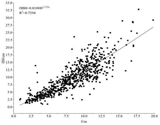 In the above formula, DBH is the diameter at breast height, and the unit is cm; H is the tree height, and the unit is m; and the correlation coefficient R2 = 0.7294.