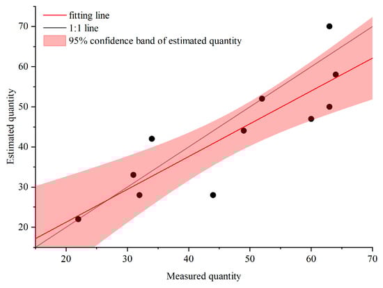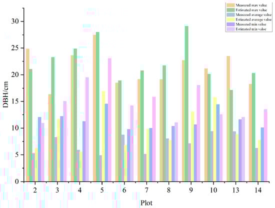 Figure 9 represents the estimated DBH of each quadrat based on point cloud data and the corresponding measured DBH. It can be seen that the DBH of locust was between 5.28 cm and 27.42 cm. According to Formula (3), the average error rate of the maximum diameter at breast height was 15%, that of the minimum diameter at breast height was 37%, and that of the average diameter at breast height was 36%.