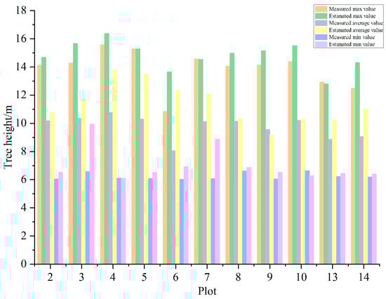 Figure 7 depicts the estimated tree height of each quadrat based on point cloud data and the corresponding measured tree height. It can be seen that the estimated height of locust is between 6.38 m and 15.58 m. According to Formula (3), the average error rate of the maximum tree height was 7%, that of the minimum tree height was 14%, and that of the average tree height was 18%.