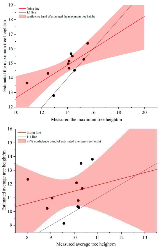 Figure 8 represents a comparison between the estimated and measured maximum and average tree height. Within the range of 10–16 m, the maximum tree height of eight out of the eleven sample plots was overestimated; in two plots, the estimated maximum tree height was the same as the measured value, and in one plot, it was lower than the measured value. Within the range of 8–11 m, the average tree height values of ten plots were overestimated, and they were underestimated for only one sample plot.
