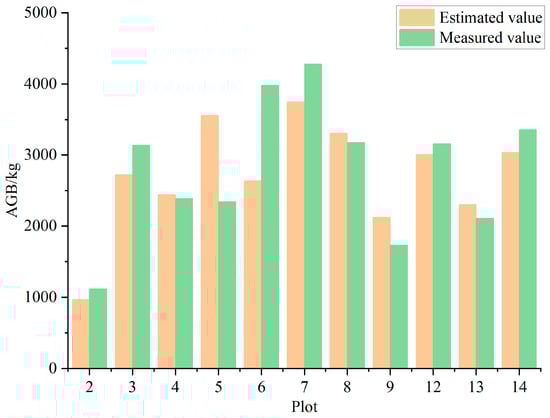 Biomass was estimated using Formulas (4) and (5). Figure 11 represents the estimated biomass value of each quadrat based on point cloud data and the corresponding measured biomass value. According to Formula (3), the average error rate of the estimated biomass value was 16%.