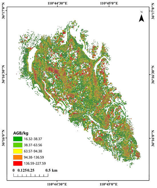 Using the above diameter–height regression equation, the diameter of individual trees segmented by point cloud data was calculated, and then the aboveground biomass of locust in the study area was estimated using the height–diameter–biomass model.