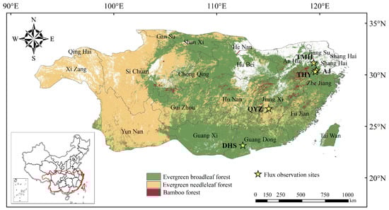 Typical subtropical forest distribution and the flux observation sites in China.