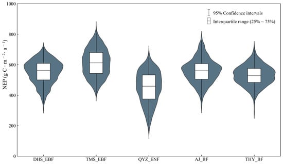 The uncertainty of the input data was calculated using the EFAST, as shown in Figure 4. The EBF (DHS site) had the highest NEP values, with a distribution ranging from 392 to 852 gC∙m−2∙a−1. The ENF (QYZ site) had a relatively scattered distribution of NEP, with a range of 150 to 690 gC∙m−2∙a−1. The NEP distribution of the BF (THY site) was relatively concentrated. Table 4 shows that there was no significant difference in the coefficient of variations (CV) between the two EBF sites, with a 13.86% CV for DHS and a 14.55% CV for TMS. The uncertainty in the ENF (CV, 23.22%) was significantly higher than that of the EBF and BF (CV = 14.24% and CV = 12.78%).