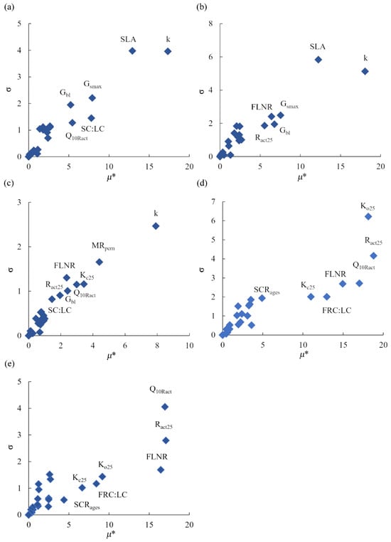 Sensitivity index (μ*) and interaction index between parameters (σ) for Morris method sensitivity analyses at each site: (a) DHS site; (b) TMS site; (c) QYZ site; (d) AJ site; (e) THY site.