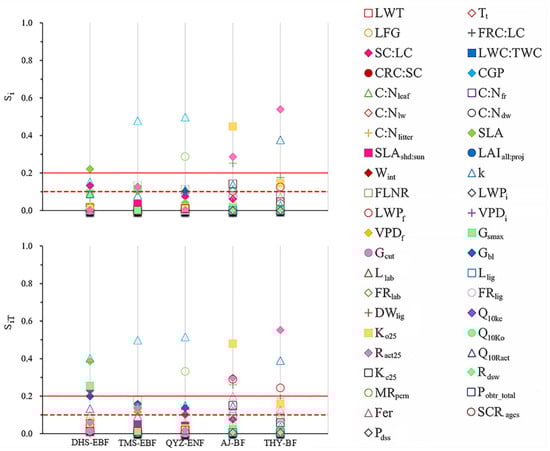 First-order sensitivity index (Si) and total-order sensitivity index (SiT) for EFAST method sensitivity analyses at each site. Sensitive and highly sensitive parameters are shown above the red dashed and solid lines, respectively.