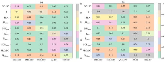 Impact of key sensitive parameters screened in each site by combining the results of the EFAST method and Morris method analyses: (a) SiT of the EFAST method (SiT > 0.1 is a sensitive parameter); (b) μ* of the normalized Morris method (μ* > 0.2 is a sensitive parameter, μ* reflects only the relative magnitude of the sensitivity of the parameter and can only be used to judge the relative magnitude of the sensitivity, and its value does not reflect the true sensitivity of the parameter).
