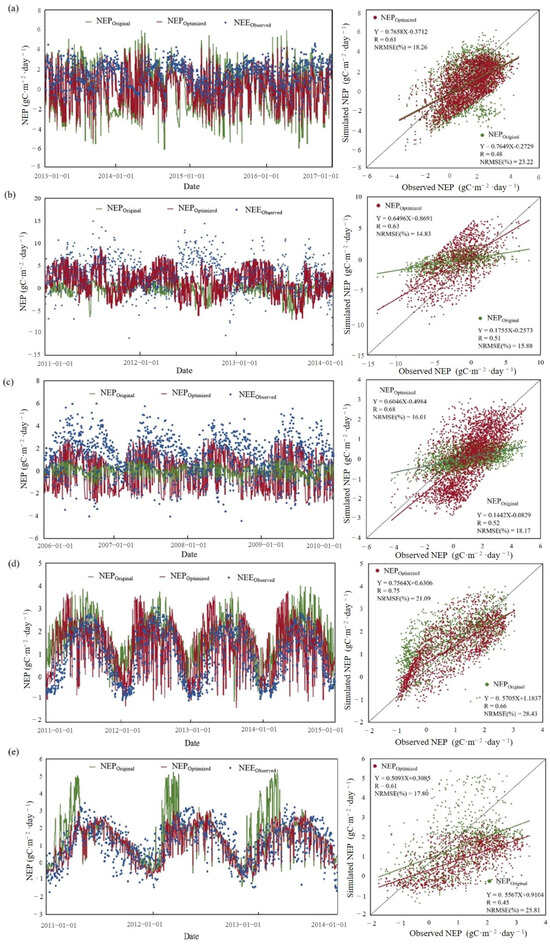 The carbon flux values simulated by the parameter localized model are closer to the flux observations than the original model. The original model had unrealistic peaks while the accuracy was significantly improved by the parameter-localized model (Figure 8). The R of NEP simulated using the original model ranged from 0.45 to 0.66 and NRMSE ranged from 15.88 to 28.43% for the five sites; the R of NEP simulated using the parameter-optimized model ranged from 0.61 to 0.75 and NRMSE ranged from 14.83 to 21.09%. Compared with the original model, the average R of the localized model improved by 25.19% and the average NRMSE reduced by 21.74%. The localized model can better simulate the changing characteristics of carbon fluxes in subtropical forests.