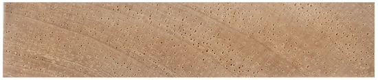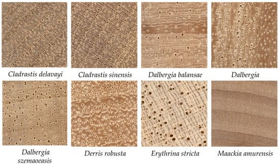 Eight wood species within the Fabaceae family were used in the experiment conducted in this study. As listed in Table 1, all samples were assigned the species ID in the xylarium of Southwest Forestry University. Furthermore, 30 samples from each species were randomly selected, and it was ensured that they were without defects and from distinct trees. The average thickness, width, and length (longitudinal) sizes of these samples were 15, 80, and 150 mm, respectively. The NIR spectral data were obtained from two transverse sections of each sample, which were carefully sanded using grits 400, 800, and 1000, sequentially, to avoid surface oxidation before spectral data collection. As shown in Figure 1, a transverse section picture of the polished surface for Dalbergia szemaoeasis is presented.