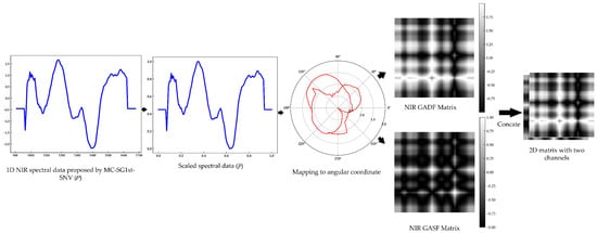 In the proposed method, the GAF method is used to convert 1D NIR spectral data into 2D data by mapping the NIR spectral data onto an angular coordinate system. As shown in Figure 2, given 1D NIR spectral data consisting of n wavelength bands, is first scaled to the range of −1 to 1, or 0 to 1, to obtain . Consequently, the normalized spectral data are represented in an angular coordinate system by representing the values as the angular cosine () and the wavelength bands as the radius (). The and the are calculated according to Equation (1):