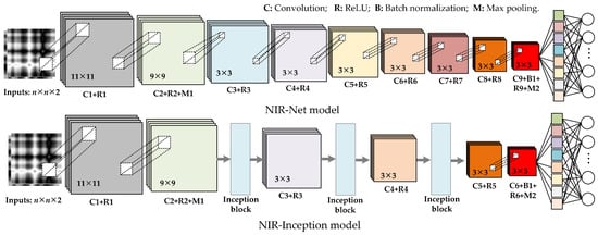 From Table 3, it is evident that some preprocessing strategies substantially enhanced the identification performance of the two proposed CNN models. For the NIR-Net model, among the nine preprocessing methods, the best classification result was obtained by the preprocessing strategy that combined MC and SG1st, which achieved mean accuracy, precision, and recall values of 96.7%, 96.8%, and 96.7%, respectively. The preprocessing strategy of combining MC, SG1st, and SNV achieved the second-best result with mean accuracy, precision, and recall values of 96.6%, 96.7%, and 96.6%, respectively. In contrast to the NIR-Net model, the preprocessing strategy of combining MC, SG1st, and SNV yielded the best result for the NIR-Inception model, which achieved mean accuracy, precision, and recall values of 97.3%, 97.4%, and 97.3%, respectively. The method of combining MC and SG1st yielded the second-best result for the NIR-Inception model, with mean accuracy, precision, and recall values of 97.3%, 97.4%, and 97.3%, respectively.