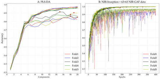 The training and validation process of the PLS-DA (A) and NIR-Inception (B) models.