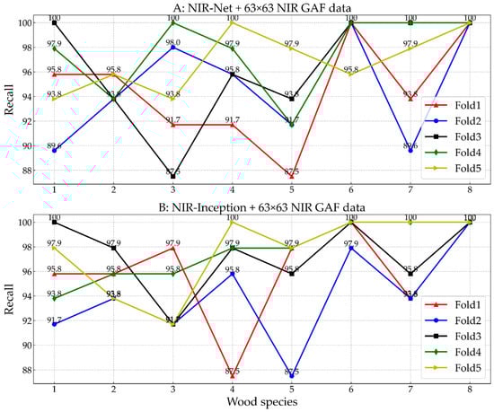Figure 6 exhibits the recall value of the proposed NIR-Net (Figure 6A) and NIR-Inception (Figure 6B) models for each species in conjunction with 63 × 63 GAF data. Some spectral data from the Dalbergia balansae, Dalbergia obtusifolia, and Dalbergia szemaoeasis species were difficult to identify, resulting in a relatively lower recall value of 87.50% in some folds.