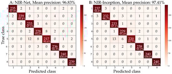 The classification confusion matrixes of five-fold validation using (A) the NIR-Net model with MC-SG1st preprocessed data and (B) the NIR-Inception model with MC-SG1st-SNV preprocessed GAF data with dimensions of 63 × 63. Labels 1 to 8 correspond to the wood sample numbers exhibited in Table 1 and Figure 5.