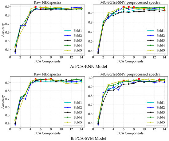 In Figure 7, the x-axis represents different PCA components, and the y-axis represents the corresponding accuracy of the optimal KNN (Figure 9A) and SVM (Figure 9B) model parameters for each fold. From the figure, it is evident that the number of PCA components significantly influenced the identification performance of the KNN and SVM models. A small number of PCA components led to a substantial loss of feature information, consequently decreasing the identification accuracy of the models. Both the KNN and SVM models demonstrated good performance on the MC-SG1st-SNV preprocessed spectral data as compared to the raw spectral data. Additionally, a notable difference was observed in the optimal number of PCA components for different methods and datasets. Overall, the SVM model outperformed the KNN model on both the raw and MC-SG1st-SNV preprocessed spectral data.
