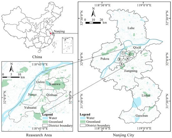 Nanjing, the capital of Jiangsu Province and a pivotal central city in eastern China, holds a crucial position as an economic hub (Figure 1). Nanjing’s strategic location significantly contributes to regional development, providing the city with abundant natural resources []. Recent assessments indicate that nearly 41% of Nanjing’s developed areas consist of green spaces, leading to its recognition as a ‘National Forest City’ due to its favorable green conditions.