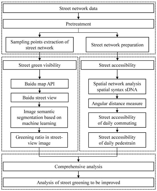 The three-step research design outlined above translates into four specific phases in practice (Figure 2). The initial phase involves data preprocessing, which includes extracting coordinates of street-view sampling points from OSM to collect street-view images for each point. Simultaneously, the road network is organized to facilitate subsequent accessibility analysis. The second stage involves collecting panoramic street photos for street greening analysis. The Baidu Application Programming Interface (API) is utilized to gather street scenery images from various points, employing machine learning algorithms for data processing. These algorithms conduct image semantic segmentation and extract the GVI, aiding in the measurement of street greening. The third step involves street accessibility analysis. Spatial syntax tools, specifically sDNA spatial network analysis, are employed to quantitatively measure daily and commuting behavior accessibility within the street network. Finally, a comprehensive analysis integrates visibility and accessibility data. This analysis assesses the alignment between how easily residents can reach streets and how much greenery they can see from those streets, essentially quantifying ‘visible greening’. This reveals priority streets for potential greening interventions within urban renewal and construction efforts across the city.
