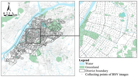The data preprocessing comprises two essential components. The first component involves extracting sampling points from street network data. Initially, the line shapefiles of streets from five urban areas in Nanjing are acquired using OSM. Subsequently, utilizing ArcGIS, the street network within administrative boundaries is clipped, and sampling points are extracted from the street shapefile at intervals of 300 m. These sampling points encompass attribute data of the original OSM streets, along with longitude and latitude coordinates. A total of 8330 street sampling points were extracted for this study. Figure 3 illustrates the distribution of all sampling points across the OSM street network. For a detailed view of each sampling point’s precise location, longitude and latitude coordinates are acquired using ArcGIS, establishing the groundwork for subsequent batch retrieval of street-view images.