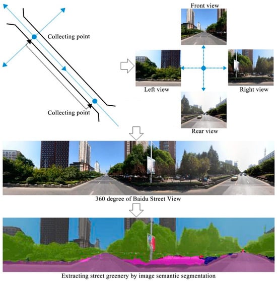 In addition to remote sensing technology, street-view images offer valuable perspectives for analyzing street greenery, with higher spatial resolution. Street-view images are captured by vehicles equipped with cameras or collected from online platforms such as Google and Baidu, providing detailed visual information about green spaces along urban streets []. Researchers can utilize street-view images to assess the quality, diversity, and distribution of street trees, parks, and other green features []. By analyzing street-view images, researchers can gain insights into the accessibility and visual perception of green spaces from pedestrians’ perspectives. In recent years, street-view images have rapidly emerged as vital data sources for geographic spatial data collection and urban analysis, offering insights and supporting informed decision-making [,,]. Furthermore, image semantic segmentation technology has become a powerful tool for extracting detailed information about street greenery from image data. Image segmentation algorithms based on deep learning and convolutional neural networks make it possible to automatically segment vegetation areas in images [,,]. These technologies enable the precise identification and classification of different types of vegetation in urban environments, such as trees, shrubs, and grasslands []. By applying image semantic segmentation, researchers can generate high-resolution maps of street greenery and quantify its spatial distribution and composition []. The proliferation of large-scale image platforms, advancements in computer vision and machine learning, and the availability of computing resources have significantly bolstered technical support for research in this field.