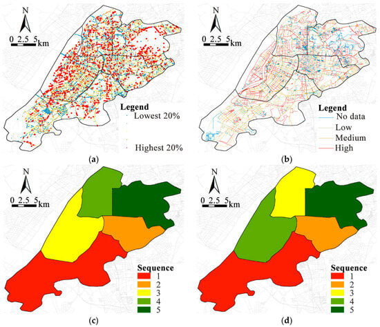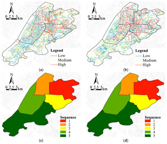 The analysis of street accessibility at both the daily pedestrian and commuting scales. (a) Street accessibility in the radius of pedestrian distance; (b) street accessibility in the radius of commuting distance; (c) sequence of streets with high pedestrian accessibility proportion; (d) sequence of streets with high commuting accessibility proportion.