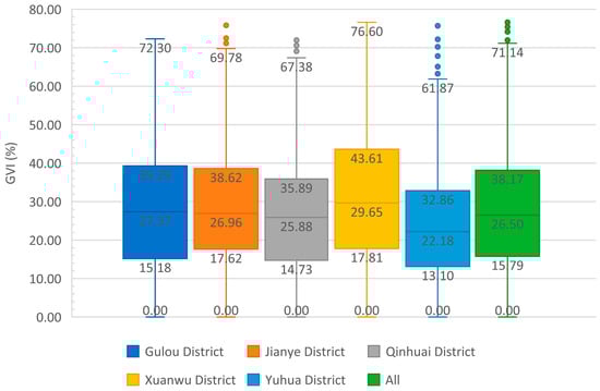 Figure 5a illustrates the GVI values across various sampling points within the research area. This study conducted a statistical analysis of the GVI values across distinct zones. As demonstrated by the boxplot (Figure 6), the GVI values of the sampling points in the research area predominantly fall within the range of 15.79% to 38.17%, with a median value of 26.50%. Overall, the median values of street greening in the five zones are relatively consistent, varying between 22.18% and 29.65%. Specifically, the median GVI of the Xuanwu District’s street sampling points is at 29.65%, with lower and upper quartiles at 17.81% and 43.61%, respectively. In comparison to other regions, this area displays a relatively higher GVI among the sampling points. Conversely, the Yuhua District’s median GVI stands at 22.18%, with the majority of its sampling points ranging between 13.10% and 32.86%. In relative terms, this area demonstrates a comparatively lower GVI among the sampled points.