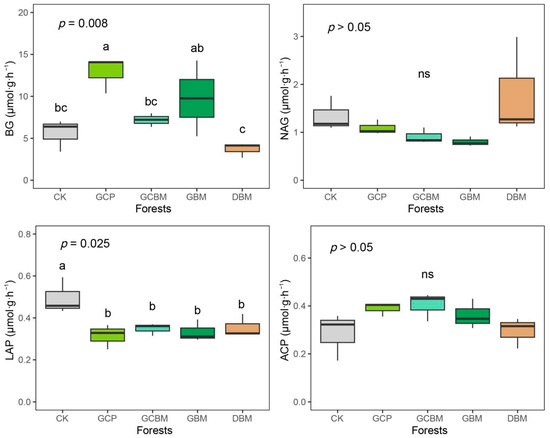 Effects of the forest type on soil enzyme activities. CK, secondary forest; GCP, pure evergreen coniferous forest; GCBM, evergreen coniferous and broad-leaved mixed forest; GBM, evergreen broad-leaved mixed forest; DBM, deciduous broad-leaved mixed forest. Different lowercase letters indicate that there were significant differences in different forests (p < 0.05). ns, p > 0.05.