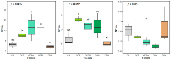 Effects of the forest type on soil enzyme stoichiometry. CK, secondary forest; GCP, pure evergreen coniferous forest; GCBM, evergreen coniferous and broad-leaved mixed forest; GBM, evergreen broad-leaved mixed forest; DBM, deciduous broad-leaved mixed forest. C/NEEA, ln(BG):ln(NAG + LAP); C/PEEA, ln(BG):ln(ACP); N/PEEA, ln(NAG + LAP):ln(ACP). Different lowercase letters indicate that there were significant differences in different forests (p < 0.05). ns, p > 0.05.