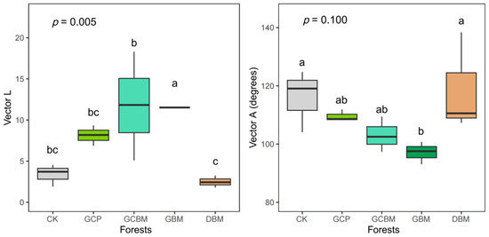 Effects of the forest type on the vector length (Vector L) and vector angle (Vector A) for soil enzymes. CK, secondary forest; GCP, pure evergreen coniferous forest; GCBM, evergreen coniferous and broad-leaved mixed forest; GBM, evergreen broad-leaved mixed forest; DBM, deciduous broad-leaved mixed forest. Different lowercase letters indicate that there were significant differences in different forests (p < 0.05).