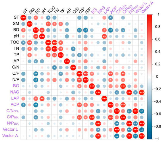 Correlations between soil physicochemical properties and enzymes. Asterisks indicate the significance of Pearson’s correlation coefficient. *, p < 0.05; **, p < 0.01; ***, p < 0.001. ST, soil temperature; SM, soil mass water content; BD, bulk density; TOC, total organic carbon; TN, total nitrogen; TP, total phosphorus; AP, available phosphorus. C/NEEA, ln(BG):ln(NAG + LAP); C/PEEA, ln(BG):ln(ACP); N/PEEA, ln(NAG + LAP):ln(ACP). Vector L, vector length; Vector A, vector angle.